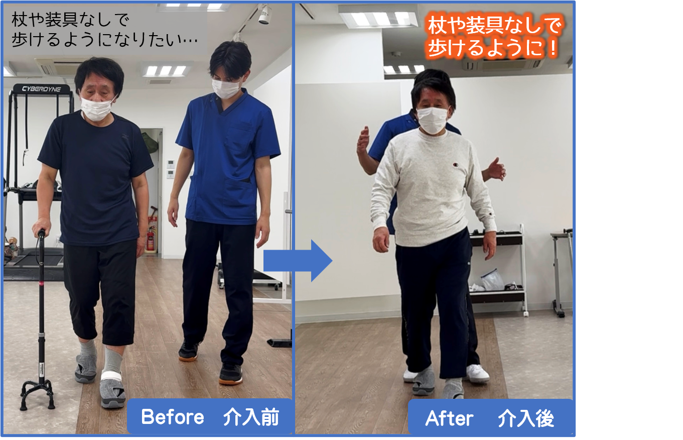 ご利用開始時からご本人様と杖や装具なしで歩けるようになる。という目標を一緒に決めてリハビリをさせて頂いておりました。1回1回のリハビリで体の筋力をつけるような練習からバランスを鍛える挑戦的な練習も取り入れ、恐怖心もある中で勇気を出して取り組んで頂きました。歩きの改善に伴ってお車の運転やお仕事の再開もでき、活動量がさらに増加できています。ご本人の頑張りがあった結果歩きの改善が認められました。今後も引き続き、さらなる改善に向けて頑張っていただければと思います。