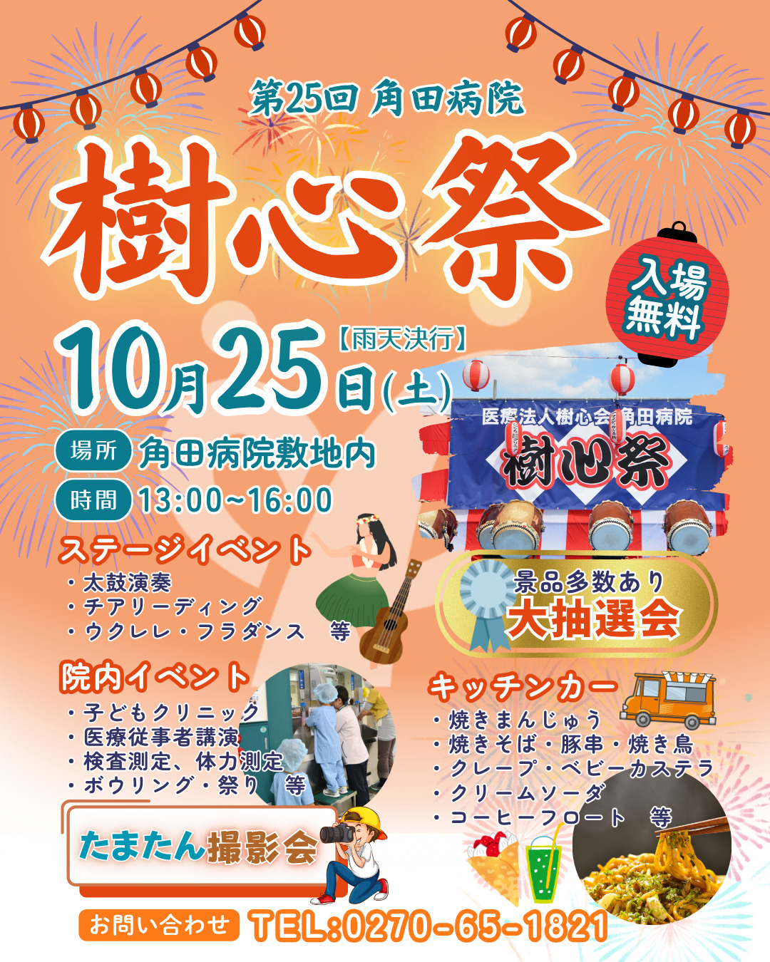 第25回を迎える今年の樹心祭は、2025年10月25日(土)13:00〜16:00、角田病院の敷地内で行われます。