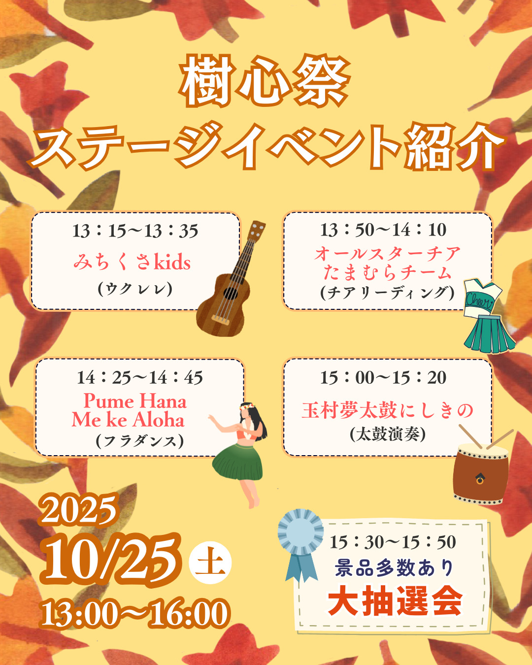 14:25からは「Pume Hana Me ke Aloha」によるフラダンスが南国の風を運び、15:00からは「玉村夢太鼓にしきの」が迫力満点の太鼓演奏を披露。最後には、大抽選会(15:30〜)!豪華景品が当たるチャンスです。