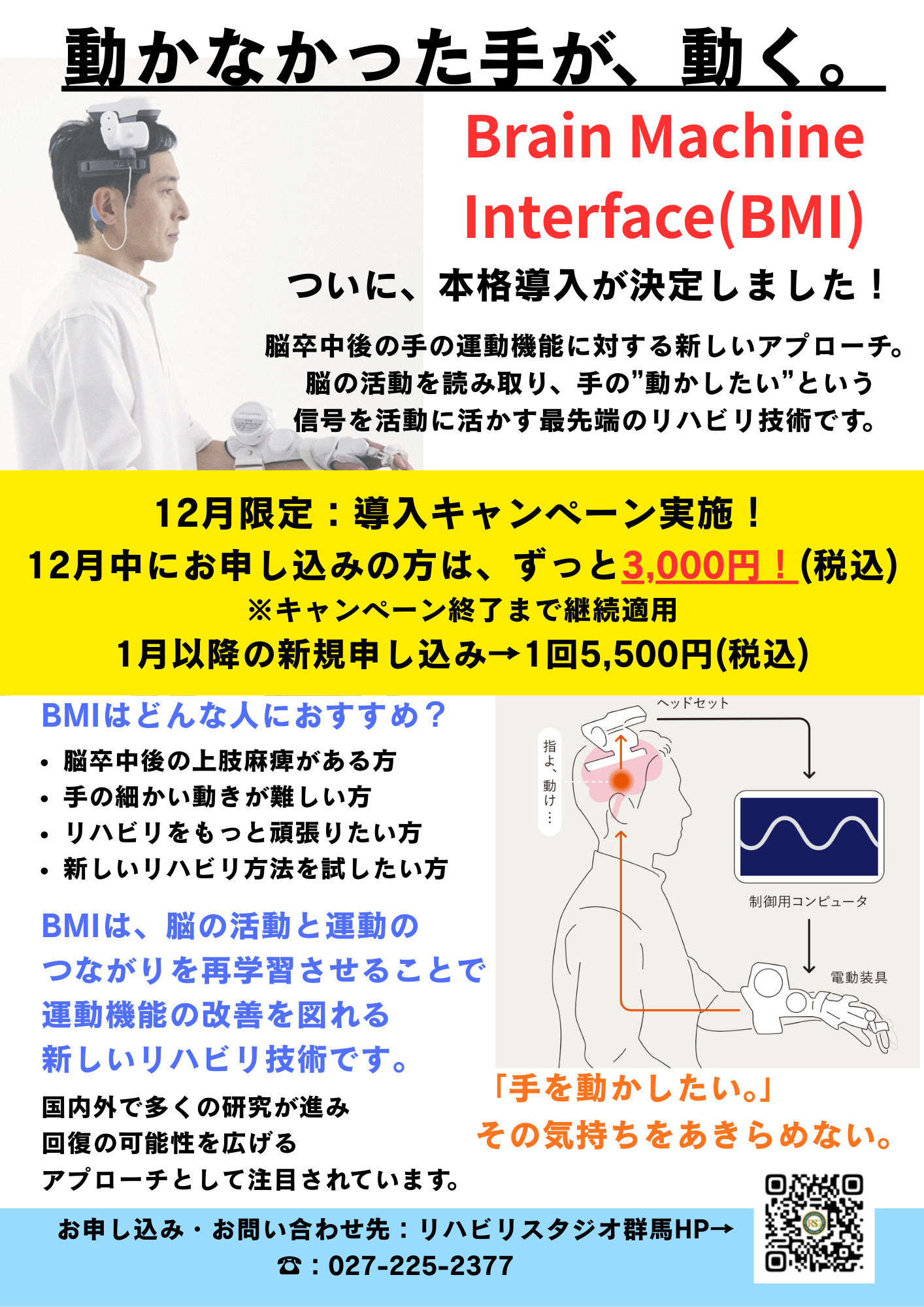 リハビリスタジオ群馬では、そのような悩みに応えるため、この度 Brain Machine Interface(BMI) を正式導入いたしました。