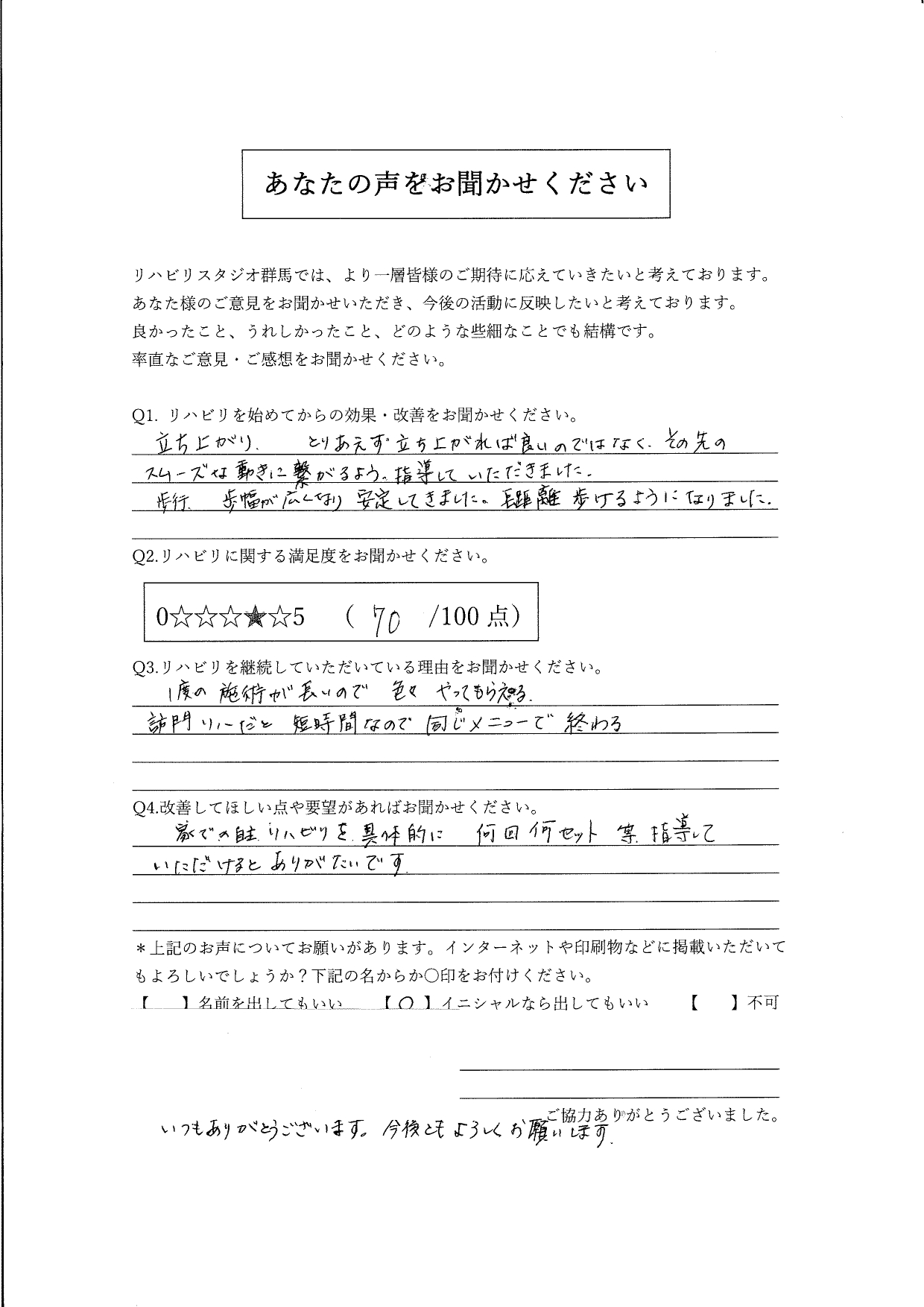 - 立ち上がりではとりあえず立ち上がれば良いのではなく、その先のスムーズな動きにつながるよう指導をしていただきました。歩行では、歩幅が広くなり安定してきました。長距離歩けるようになりました。
