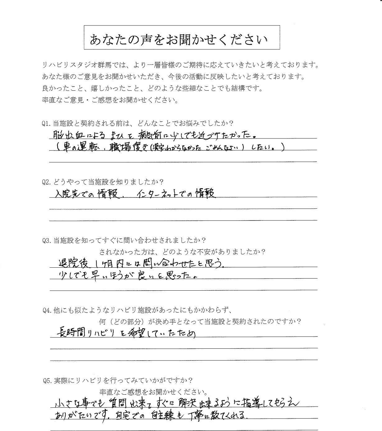 - 他にも似たようなリハビリ施設があったにもかかわらず、何(どの部分)が決め手となって当施設と契約されたのですか?
